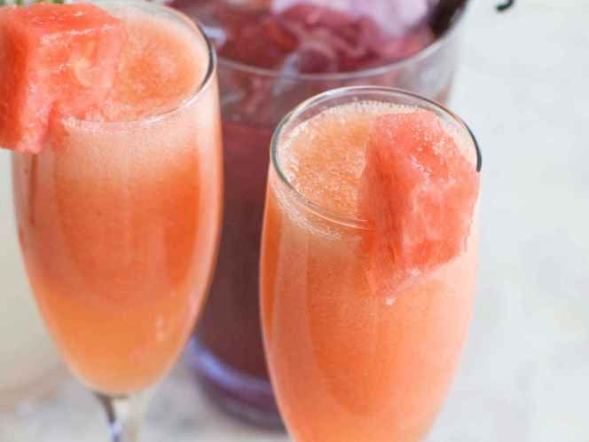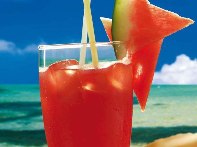 SANDIA 3 – Un smoothie es una bebida cremosa que se elabora con trozos de fruta mezclados con zumo, productos lácteos (leche, helado, yogurt) y en hielo. Necesitas: media sandía cortada en trocitos, 200 gramos de hielo, 2 fresas, 4 cucharadas de zumo de limón, azúcar al gusto. Bate todos los ingredientes hasta obtener una consistencia suave. Decora la copa con una rajita de sandía.