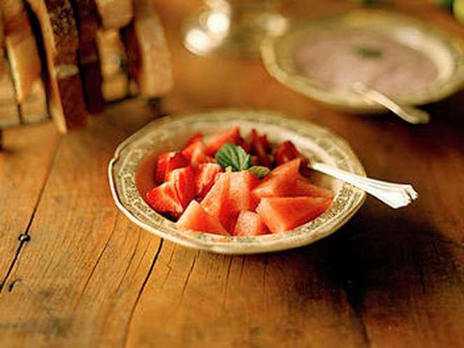 SANDIA 5 – Ensalada de sandía y fresas, Corta una sandía en triángulos pequeños, añade unas fresas en trocitos y aliña con zumo de naranja que habrás macerado una hora con hojas de hierbabuena.